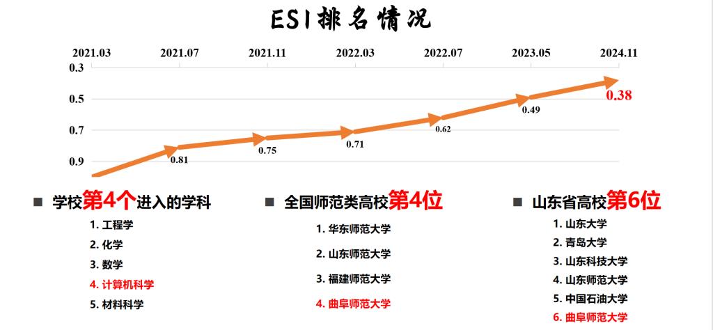 2024年,计算机科学学科ESI前1%排名稳中有进,排名百分位0.38,位居全国师范类高校第4位,省属高校第4位,跃入全国师范类高校第一梯队。计算机科学与技术学科入选2024年软科中国最好学科,排名全国134位,位居全国前47%,是我校17个入榜学科之一。2024-2025 U.S. News世界计算机科学排名中国内地上榜68位。2024软科中国大学专业排名,篮球现场直播