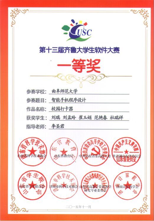 2015年12月5日上午,第七届山东省科技节系列活动之第十三届齐鲁大学生软件设计大赛颁奖大会在山东建筑大学举行,信息科学与工程篮球直播吧 在本次比赛中获得一等奖两项、二等奖四项、三等奖六项,刘智斌、李圣君两位老师被评为优秀指导教师,篮球直播吧 被评为优秀组织单位。