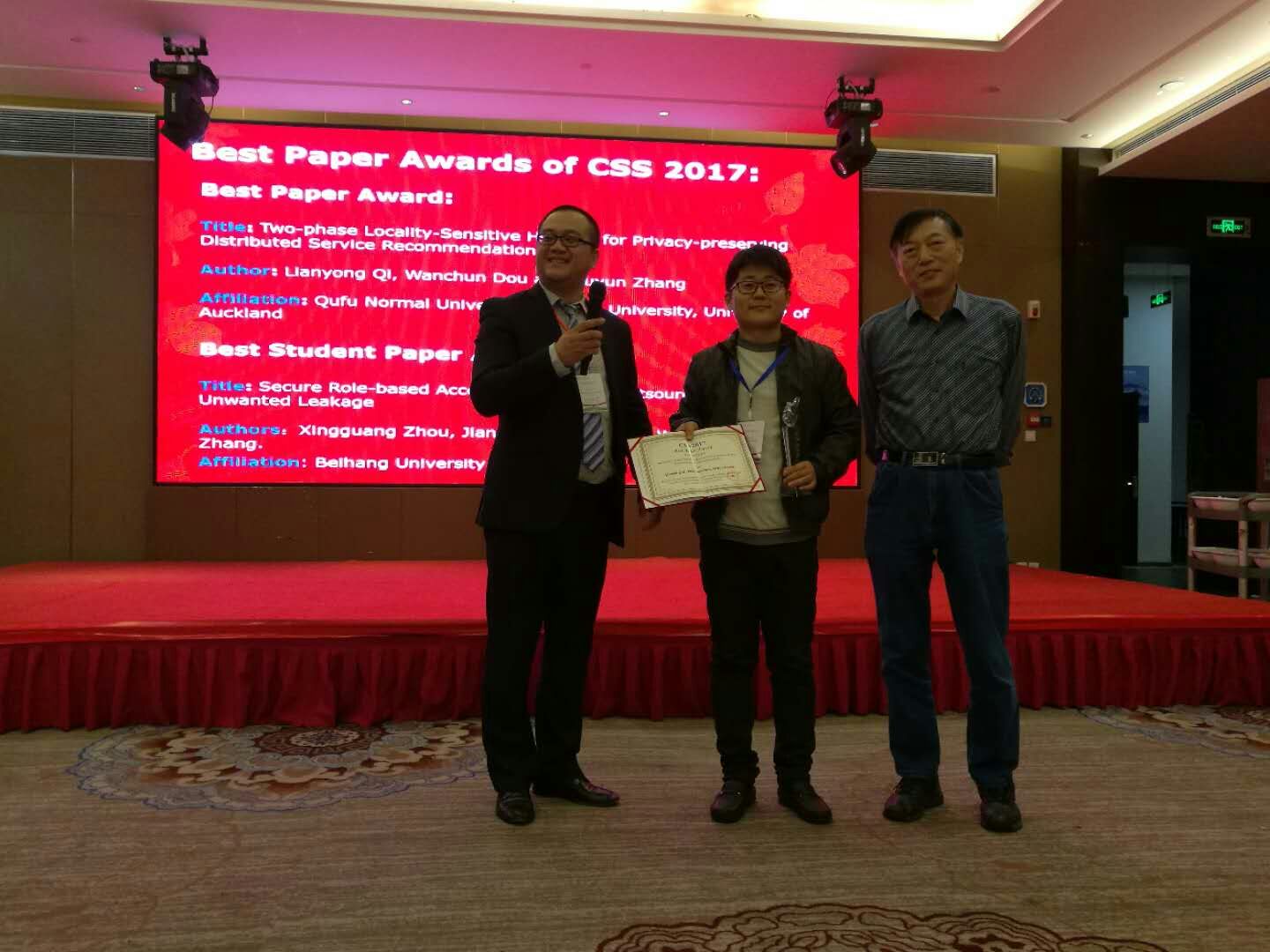 日前,第九届网络空间安全国际研讨会(CSS 2017, 9th International Symposium on Cyberspace Safety and Security)在中国西安举行。会议共收到来自美国、英国、法国、日本、澳大利亚、新西兰、印度、波兰、新加坡、香港、台湾等近二十个国家和地区的投稿论文140余篇。经过两轮专业评审,最终评选出2篇会议最佳论文:教师最佳论文1篇、学生最佳论文1篇。我院副教授齐连永老师的论文《Two-phase Locality-Sensitive Hashing for Privacy-preserving Distributed Service Recommendation》喜获会议最佳论文奖(教师)。论文通过两阶段的哈希技术来有效保护推荐系统中的用户隐私,从而确保用户敏感信息的安全可控,其研究工作得到了评审专家及与会者的一致认可。