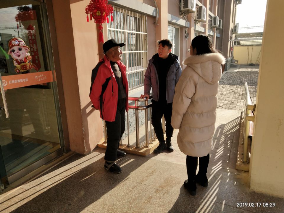 2月18日,实践队员们再次来到日照街道敬老院。实践队员刚刚到达门口,敬老院的保安人员便远远认出了队员们,打开大门等候队员。在院长办公室,队员们对院长进行了一次深度访问,向院长提出许多关于养老敬老方面的问题。了解到了目前日照市大部分敬老院模式主要是公办民用,医养结合。在政府出资修建敬老院,提供设备的情况下,由民营养老企业进行托管,提供专业化养老服务,在当今政府购买社会服务的大趋势下,是一种有益的探索尝试。据院长介绍,日照街道敬老院主要收容五保老人和部分社会赡养老人,五保老人在敬老院中保吃保住保穿保医保葬,有敬老院和老人籍贯所在的村委会分担老人的医疗费,能够满足老人基本医疗需要。