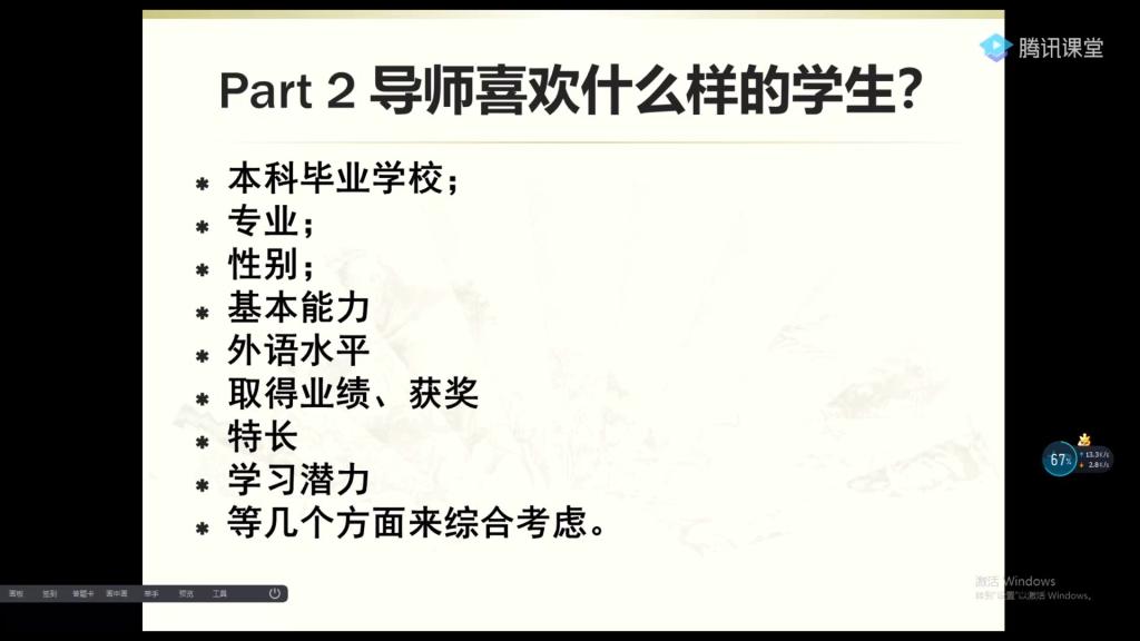 崔新春老师结合大多数学生提出的问题,就“研究生面试中的几个注意问题”与同学展开探讨、举例分享。所谓“知己知彼,方能百战不殆”,万事取其“庸”,通过现象看本质。会议首先从“为什么进行考研复试”及“面试目的”入手,结合实例展开讲述,延伸出本次指导会议的重中之重——导师喜欢什么样的学生?考生只有充分掌握了这些信息才能有一个清晰的目标方向,做到“对症下药”。崔新春老师指出,大家应在面试过程中回答问题答案内容充实而逻辑清晰、礼貌当先、仪表庄重、言行举止落落大方、不卑不亢、谈吐清晰、语速平缓,遇到问题或突发情况要懂得随机应变;英语口语尽管不熟练,也做到平静自然,专业课考试时,不紧张、做到三思而后行。