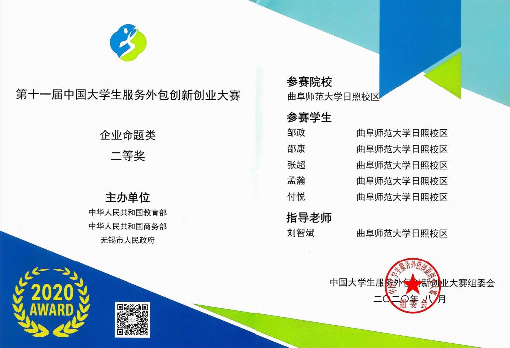 学生邹政、邵康、张超、孟瀚、付悦五人组成的团队在第十一届中国大学生服务外包创新创业大赛中获得企业命题类二等奖的优异成绩。