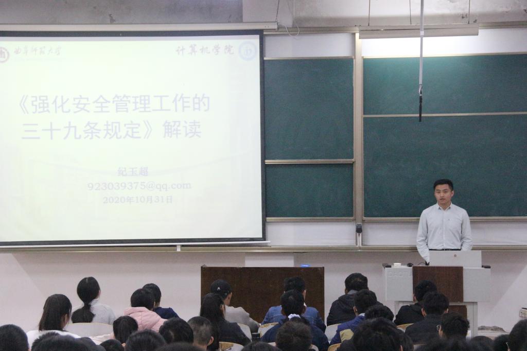 《强化安全管理工作的三十九条规定》(以下简称“九三九”规定)解读会议于JE104教室举行。2018级辅导员纪玉超出席此次会议,2020级学生干部参加本次会议。