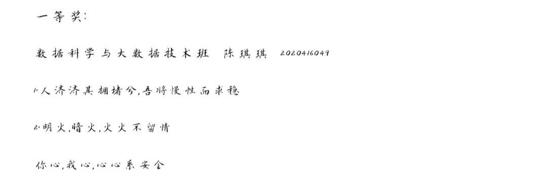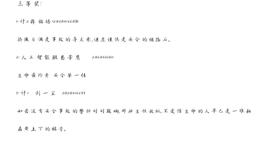 本次活动设有一等奖一名同学,二等奖两名同学,三等奖三名同学,征集作品类型可以为标语口号、格言警句、对联、谚语、座右铭等,参赛作品必须为原创,紧扣安全主题,且每条字数不超过30字,参赛同学将参赛作品交给本班安全委员。活动期间,2020级同学踊跃报名,积极参加,充分发挥自己的想象力与创造力,文思泉涌,创作出多份优秀的安全标语,简洁明快,打动人心,赛出了属于自己的风格色彩。最后,安全部成员就所收集的安全标语进行投票,根据每份标语所得票数依次划分出一、二、三等奖。
