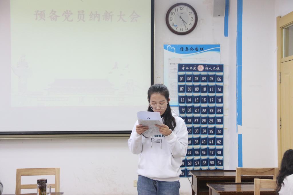 大会伊始,于运清向大家介绍本次大会的会议议程并奏国际歌。随后,与会预备党员发展对象依次宣读《中国共产党入党志愿书》,介绍个人经历,向组织汇报入党动机以及对党的认识,表明想要入党的坚定决心和认真态度。接着由入党介绍人介绍发展对象的基本情况和政治审查情况,对几名同志的表现进行了公正客观的评价,并对其能否入党表明意见。同时,与会党员充分讨论,纷纷表达自己的意见。随后,由发展对象表态发言,承诺接受批评指正,不忘初心跟党走,在今后的学习工作中,坚定目标、严格要求自身,努力改正现有不足。经过正式党员无记名投票,支部现有正式党员一致同意接收与会申请人为预备党员的决议。最后,党委副书记肖龙航对各位新进党员表示热烈的欢迎,同时着重强调了发展党员工作责任监督制度,提出会议常态化,并勉励同学们树立良好榜样,提高自身修养,为自身全面发展奠定基础。