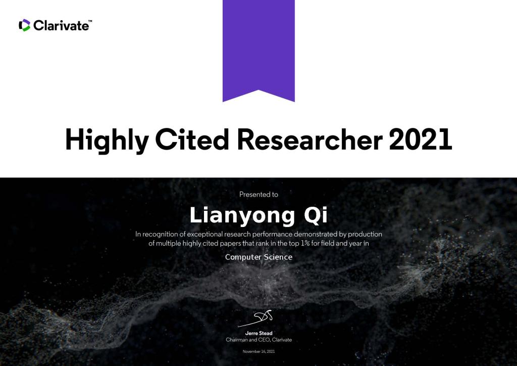 2021年11月16日,科睿唯安公布了2021年度“高被引科学家”名单,来自全球70多个国家和地区的6602人入选,中国内地共有935人次上榜(其中,计算机学科共36人),我院教师齐连永成功入选。