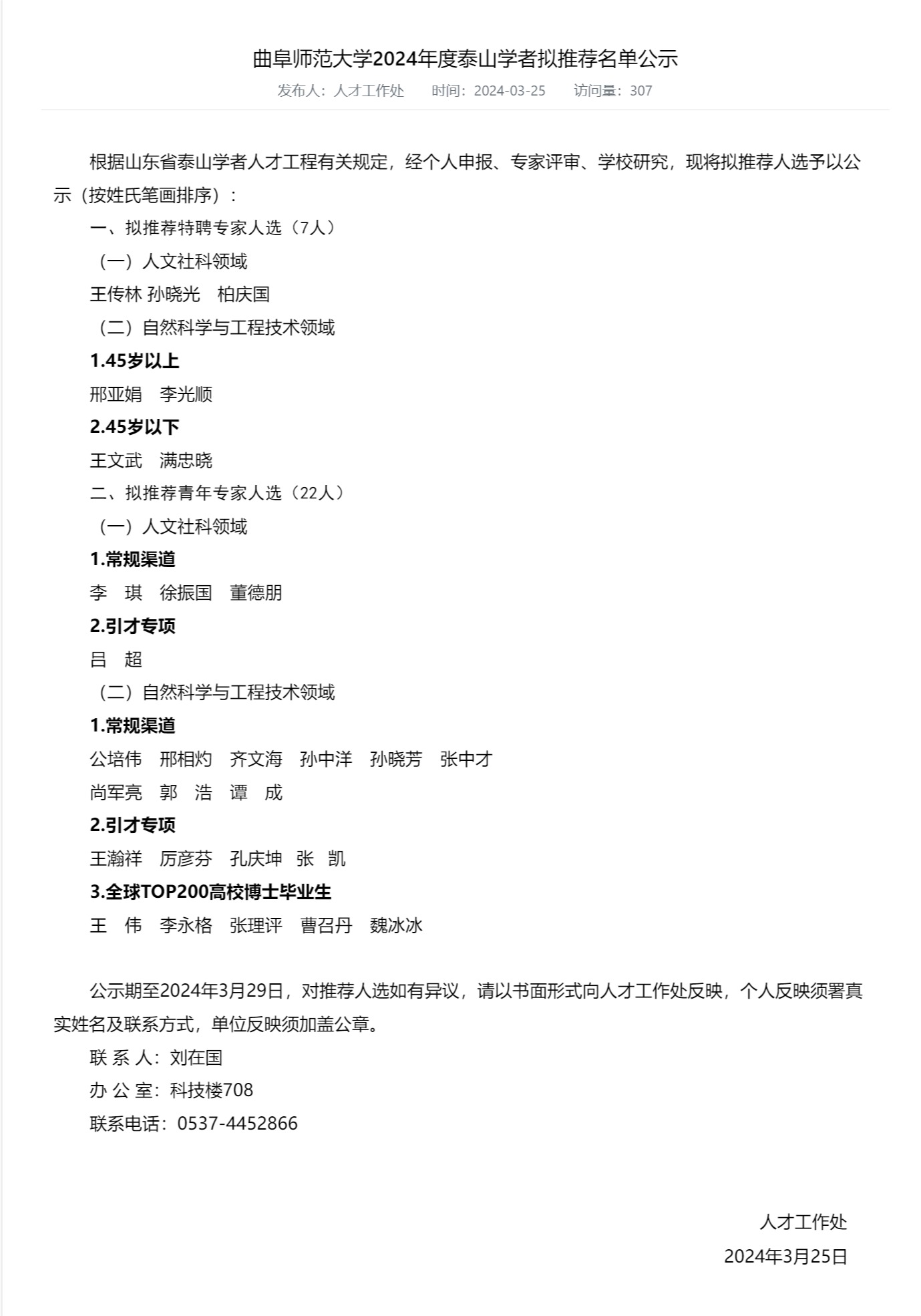 2024年3月25日,曲阜师范大学2024年度泰山学者拟推荐名单公示,篮球现场直播