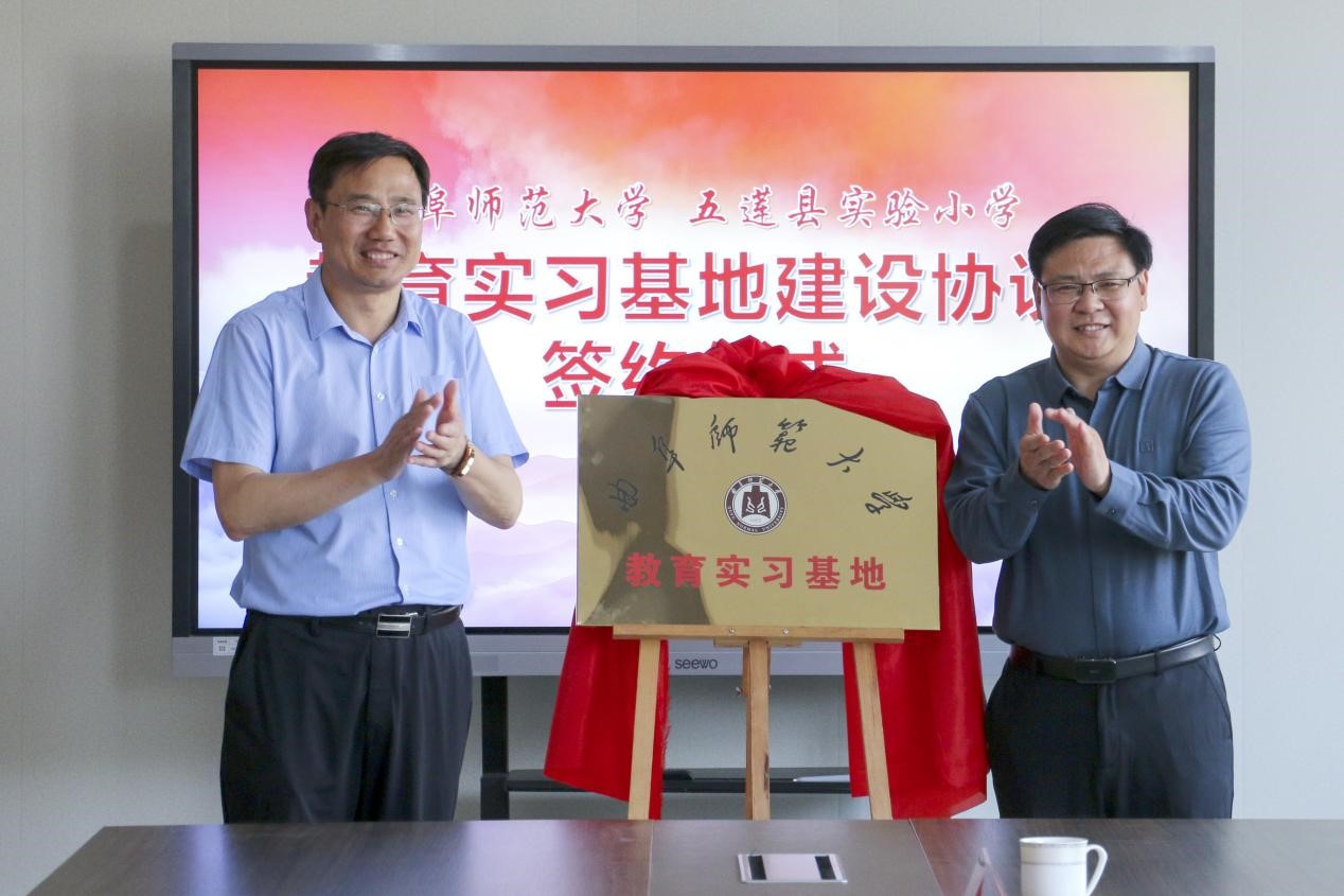张明洁分别与济宁一中任城校区执行校长房晓辉、五莲县实验小学校长陈祥权、五莲中学校长魏本福签订“曲阜师范大学学生实习基地”协议。张明洁、李光顺与各学校校长共同为基地揭牌。