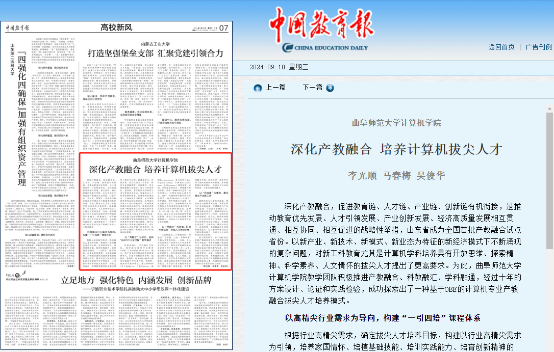 9月18日,《中国教育报》以《曲阜师范大学:深化产教融合 培养计算机拔尖人才》为题,报道了我院关于计算机专业产教融合拔尖人才培养模式的教学成果。
