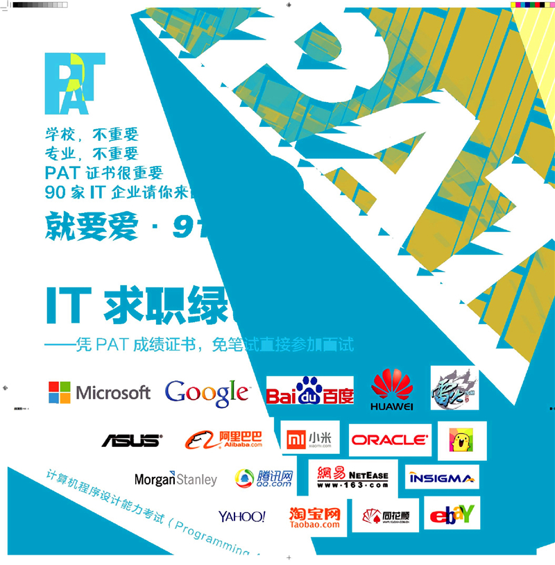 创办并由高等教育出版社有限公司独家运营的计算机程序设计能力考试(Programming Ability Test,简称PAT),旨在培养和展现学生分析问题、解决问题和计算机程序设计的能力,科学评价计算机程序设计人才,为IT企业选拔人才提供参考标准,目前联盟企业有100多家,包括Google中国、Microsoft、华为、雅虎、百度、腾讯、阿里巴巴、淘宝(中国)、奇虎360等国内顶尖的IT企业都已划定免笔试PAT分数线,这些企业每次收到数据包后会主动联系考生,所以“PAT就是IT界的托福”,一次考试相当于通过N家公司的笔试,证书2年内有效。通过PAT认证考试可以为自己早日开启就业的绿色通道。我院学生在今年3月份举行的首届PAT考试中就取得可喜的成绩,通过率居全国同类学校前茅,全国总共十多个甲级满分名额中就有我们的一席之位。