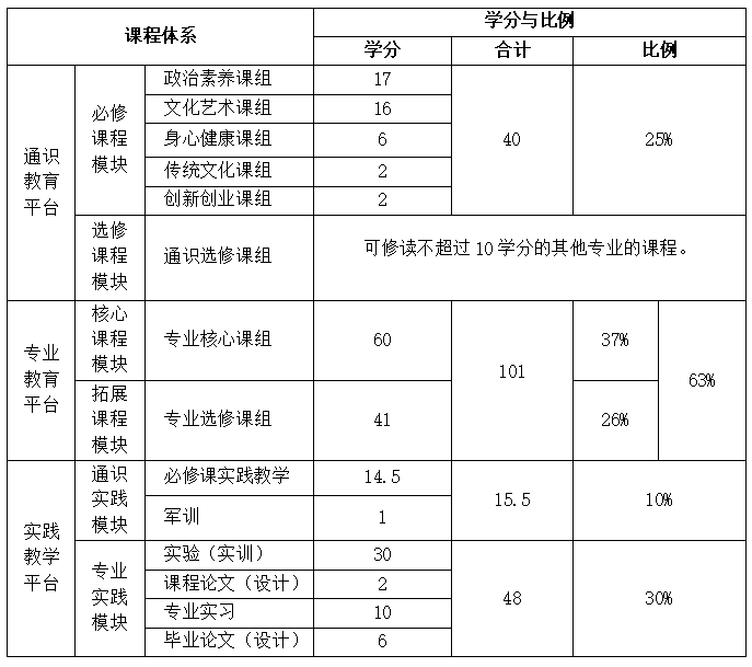 说明:表中通识必修课程模块的40学分中,含通识必修课程实践教学的14.5学分;专业教育平台的101学分中,含专业实践模块实验(实训)的30学分。