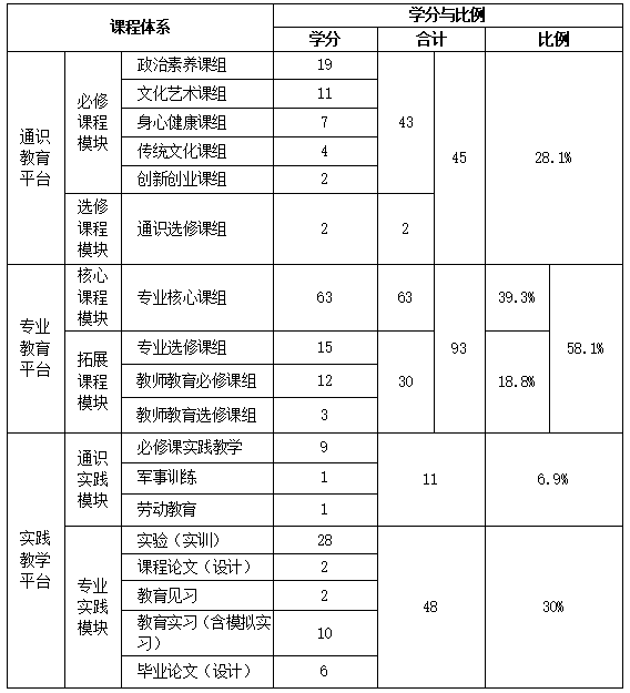 说明:表中通识必修课程模块的43学分中,含通识实践模块中必修课程实践教学的9学分;专业教育平台的93学分中,含专业实践模块实验(实训)的28学分。