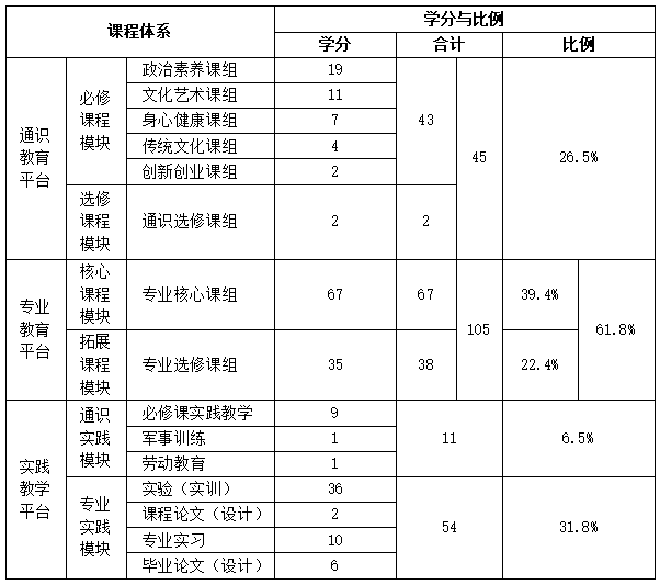 说明:表中通识必修课程模块的43学分中,含通识实践模块中必修课程实践教学的9学分;专业教育平台的105学分中,含专业实践模块实验(实训)的36学分。