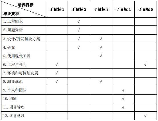 说明:毕业要求对培养目标子目标的支撑用“√”表示