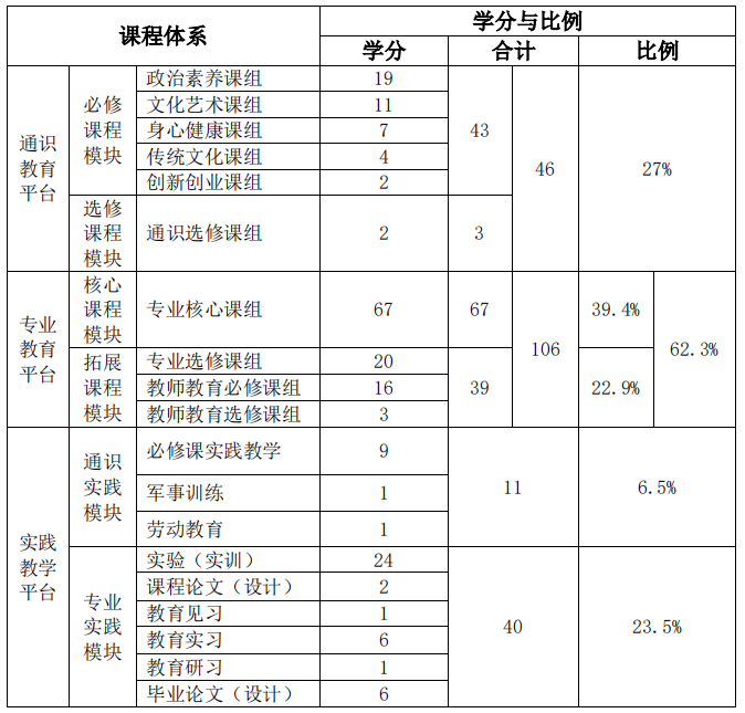 说明:表中通识必修课程模块的43学分中,含通识实践模块中必修课程实践教学的9学分;专业教育平台的103学分中,含专业实践模块实验(实训)的24学分。