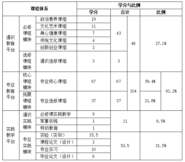 说明:表中通识必修课程模块的43学分中,含通识实践模块中必修课实践教学的9学分,专业教育平台的104学分中,含专业实践模块实验(实训)的35.5学分。
