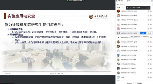 一元复始,万象更新。程老师强调,同学们要瞄准高标准,锐意进取,开拓创新,深入践行总体国家安全观,守正创新,筑牢国家安全底线。从身边的事情做起,遵守学校、实验室安全管理制度,自觉维护实验室和宿舍环境安全。