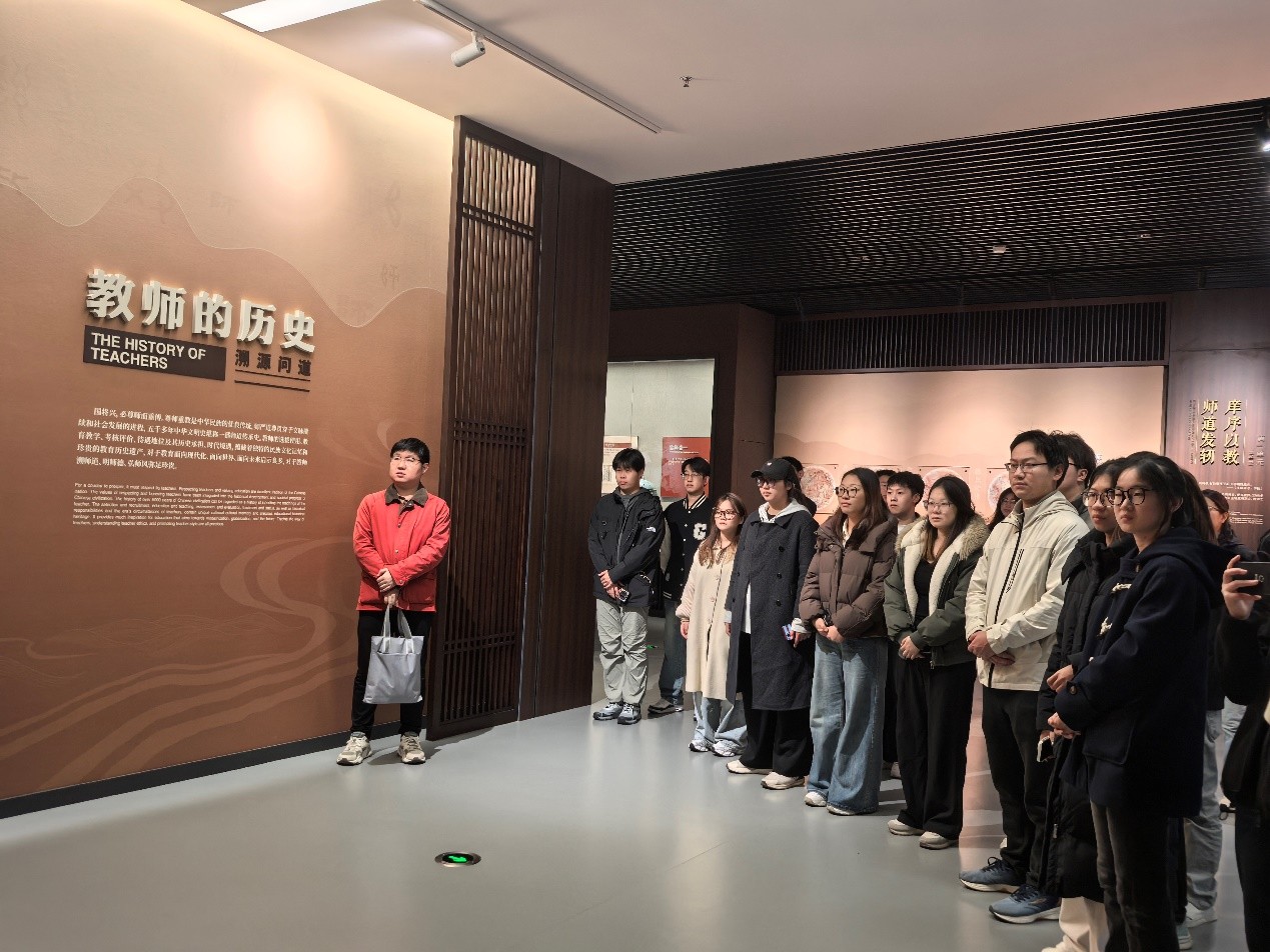 随后,在讲解员引导下,师生们依次参观了“教师的历史”“教师的摇篮”“教师的典范”三大展厅。从孔子杏坛讲学的场景复原到新时代人民教育家的先进事迹;从传统教育典籍到现代教育技术成果,丰富的文物史料与互动展陈,系统展现了我国教育事业的发展脉络。在“教师的典范“展区,大家纷纷驻足瞻仰历代教育名家风采,袁隆平科研手稿、优秀教师工作日记等实物展品引发强烈共鸣,使师生们深刻体会到教师职业的责任担当。