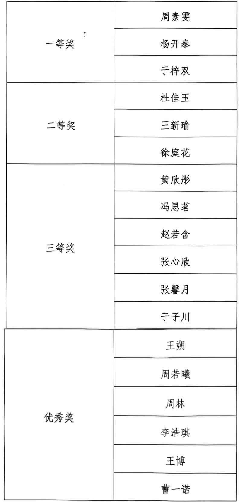经过严格公正的评选,本次活动共评选出一等奖3名、二等奖5名、三等奖7名及优秀奖6名。获奖名单如下: