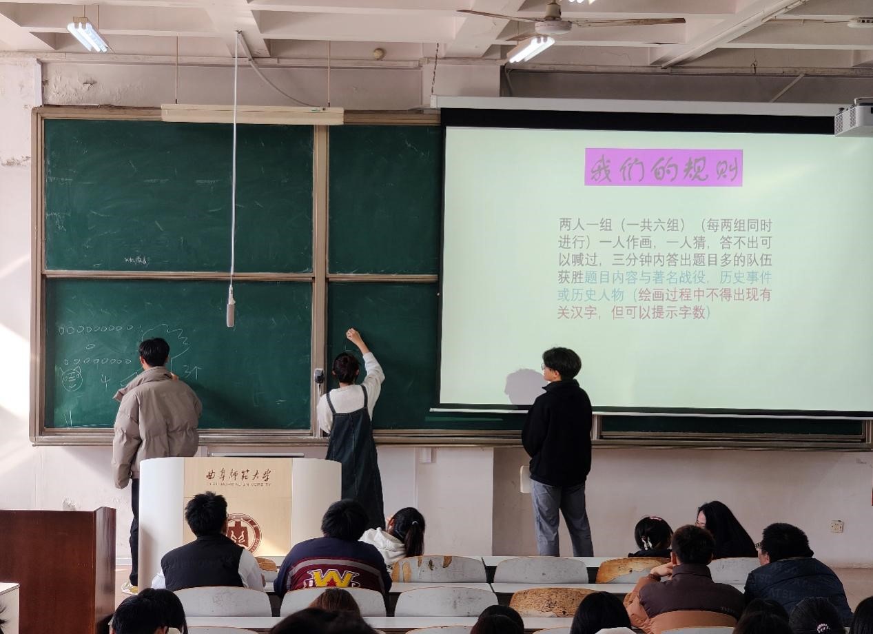 团课伊始,由团支书介绍主题团课意义与团课流程,鼓励每位同学积极参与。接着开展了一系列有趣且具有教育意义的挑战,通过“绘画接力”,同学们在接力创作中深化了对历史文化的直观感受;“知识抢答”则以抢答形式,激发了大家探索历史知识的热情与竞争意识;更有“文疯狂文化蹲”,以活泼的游戏方式,让参与者在欢声笑语中加深了对多元文化的理解和尊重。这些精心设计的活动不仅促进了同学们对历史文化的深刻认知,更在无形中强化了作为共青团员的高度身份认同与责任感。
