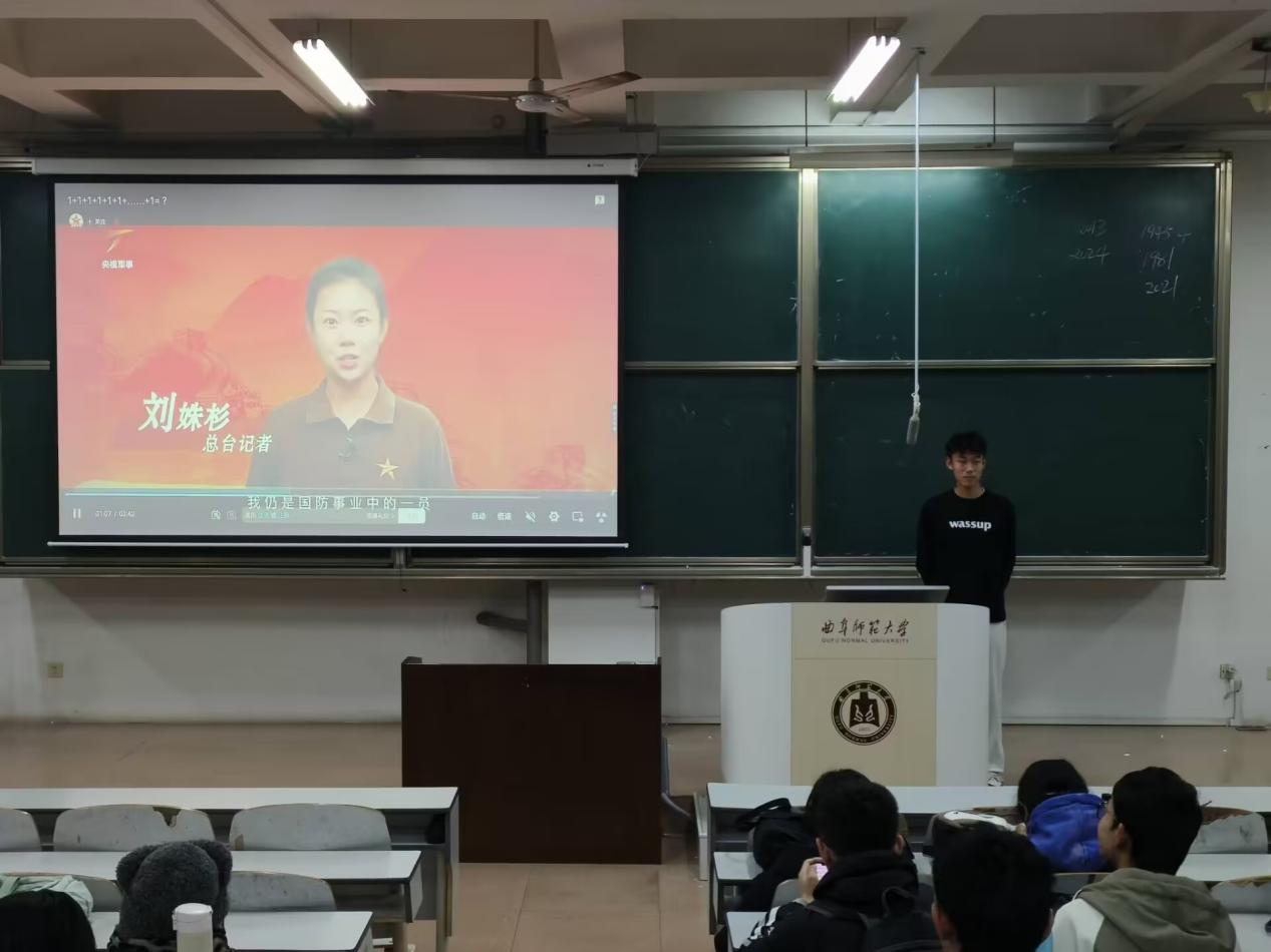 接着,组织委员为同学们进行国防安全知识讲解,他系统地向与会同学讲解了国防安全的基础知识,涵盖国防安全的基本概念、当前国家安全面临的威胁与挑战,以及国防安全相关的法律法规等内容,并通过生动具体的实例,使同学们能够更加直观且深刻地认识到国防安全的重要性。