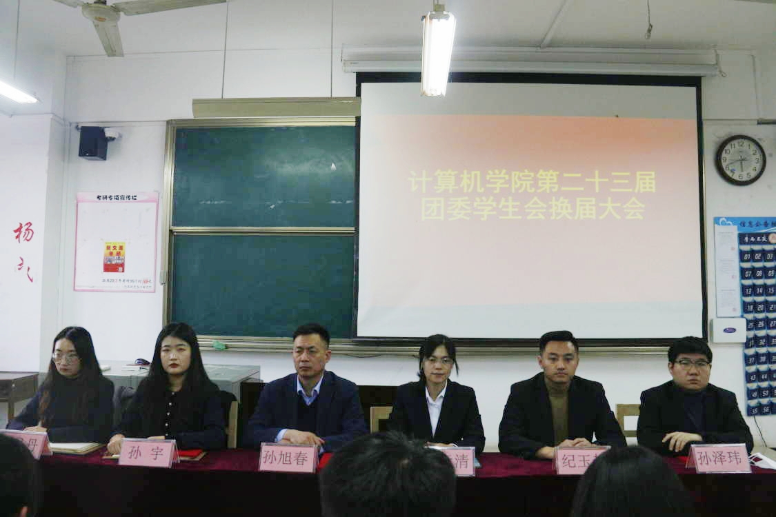 于JC412举办第二十三届学生代表大会,党委副书记孙旭春、团委书记于运清、本科生党支部书记孙宇、辅导员纪玉超、杨丹丹、孙泽玮出席,22届、23届团委学生会成员参加,22级学生代表钟嘉怡主持本次会议。