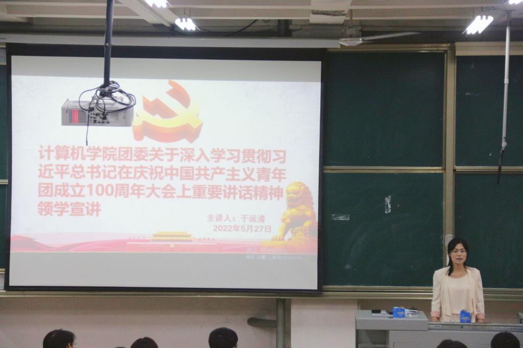 学子充分调动自己的创造力,发挥自己的价值,跟党走、听党话。接着,于老师通过宣传视频,向同学们展示了中国共产党团结带领中国人民开创崭新未来的光辉历程,增强了同学们的使命感和责任感。视频结束后,于老师向同学们传达出“志存高远方能登高望远,胸怀天下才可大展宏图”的精神,鼓励同学们践行初心、担当使命,勇做中华民族伟大复兴“中国梦”的追梦者、圆梦者。最后,于老师希望同学们能够坚定自己的理想信念,不忘初心,方得始终。同时,她表示“请党放心、强国有我”不仅仅是一句誓言,更是新时代中国青少年应该有的样子,是党的青年组织必须有的风貌。团课结束后,团委副书记胥保龙带领计算机学子进行了进一步的学习,了解了共青团更多的历史。