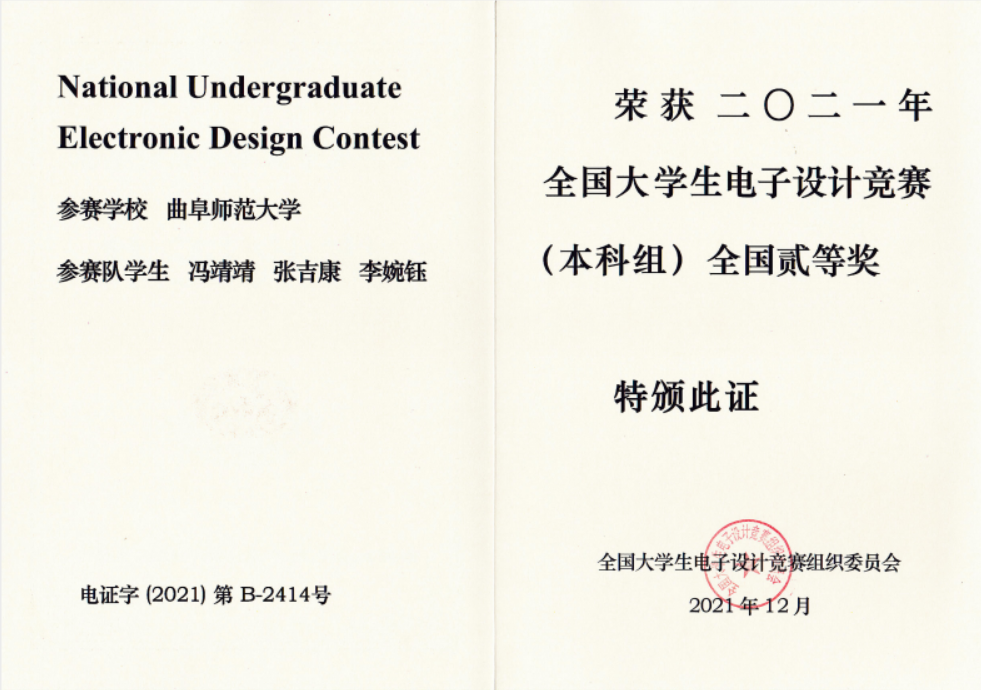 2021年12月20日,2021年全国大学生电子设计大赛成绩公布,我院学子在本次大赛中喜获佳绩。其中,由吴俊华老师指导的李婉钰、冯靖靖、张吉康队伍获得国家级二等奖,韩宇硕、魏哲南、姜梅雪获得省级三等奖;由张秀娟老师指导的贾宝玺、范树玉、孟凯队伍获得省级二等奖;由李光顺老师指导的周晓萌、单莹璐队伍获得省级三等奖。