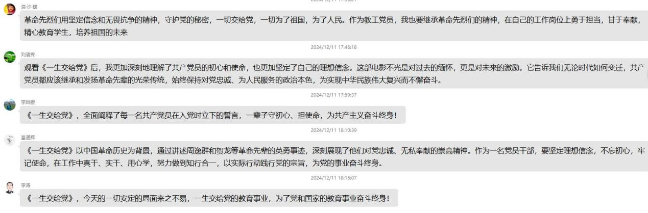 其他同志也纷纷发言,大家纷纷表示,《一生交给党》这部影片全面阐释了每一名共产党员在入党时立下的誓言,一辈子守初心、担使命,为共产主义奋斗终生。今天的一切安定局面来之不易,我们要把一生交给党的教育事业,为了党和国家的教育事业奋斗终生。