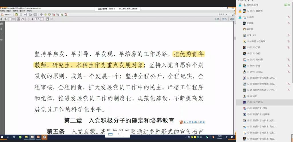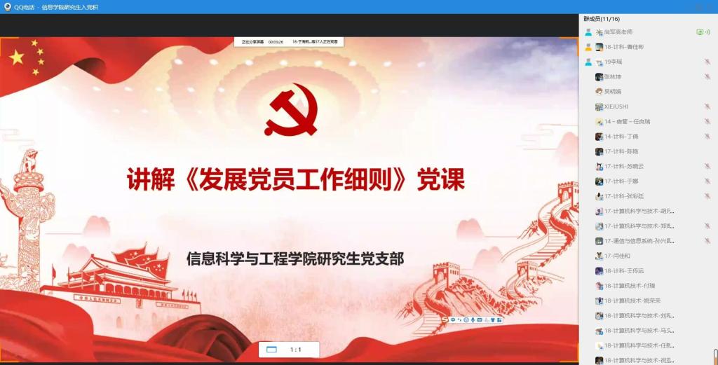 为进一步端正入党积极分子的入党动机,做好基层组织发展党员工作。6月5日下午4点,信息科学与工程篮球直播吧 研究生党支部组织开展线上专题党课活动,本次党课以解读《曲阜师范大学发展党员工作细则》为主题,信息科学与工程篮球直播吧 研究生党支部书记尚军亮出席并担任主讲,支部全体入党积极分子参加了本次党课。