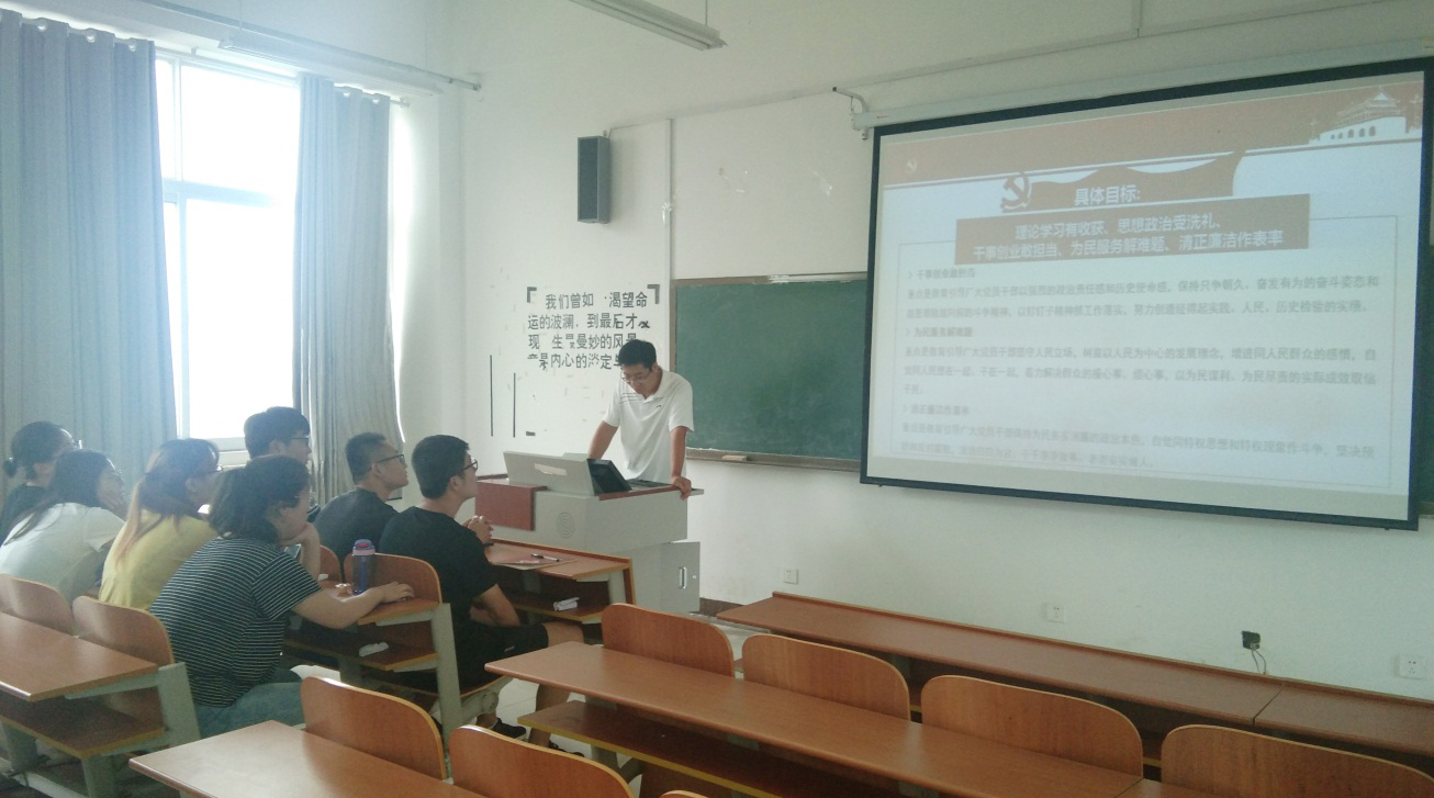 随后,支部书记尚军亮老师就习近平总书记重要讲话精神,结合支部实际,对准目标,向全体研究生党员提出三点具体要求:一是要把学习贯彻习近平总书记重要讲话作为当前一项重要政治任务,要求支部党员深入学习《习近平关于“不忘初心、牢记使命”重要论述选编》、《习近平新时代中国特色社会主义思想学习纲要》等重要内容;二是要用好“学习强国”、“灯塔在线”两个平台,加深对习近平新时代中国特色社会主义思想和党中央大政方针的理解,增强贯彻落实的自觉性和坚定性,提高运用党的创新理论指导实践、推动工作的能力;三是要发挥专业优势,与时俱进,充分重视科研,努力搞好科研,保持只争朝夕、奋发有为的奋斗姿态,发挥好党员的模范带头作用。