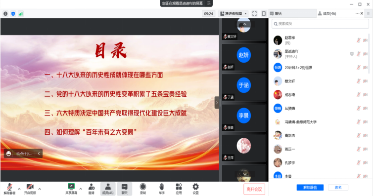 会议由分党校秘书长焦迪领学。此次理论学习主要从四方面展开,包括“十八大以来的历史性成就体现在哪些方面”、“党的十八大以来的历史性变革积累了五条宝贵经验”、“六大特质决定中国共产党取得现代化建设巨大成就”以及“如何理解‘百年未有之大变局’”。在介绍十八大以来党和国家事业取得的历史性成就的同时,向党员总结了党的五条宝贵经验及六大特质,并对“何为百年未有之大变局”做出了阐释。