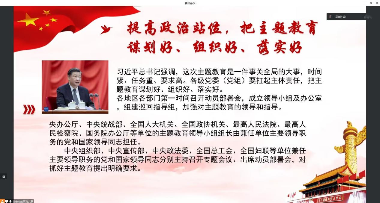 会上,党秘董俊杰从习近平总书记在主题教育工作会议上的重要讲话的基本内容讲到了学习贯彻习近平新时代中国特色社会主义思想主题教育会议精神。习近平总书记在主题教育工作会议上的重要讲话,高屋建瓴、视野宏大、思想深邃、内涵丰富,为开展主题教育指明了方向、提供了根本遵循。