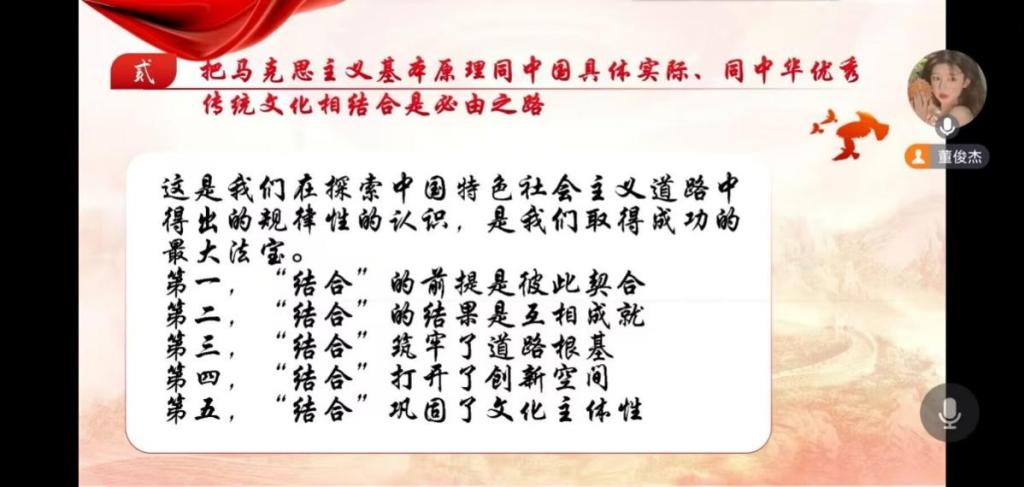董俊杰指出,作为新一代的共产党员要秉持开放包容的态度,坚持马克思主义中国化时代化,传承发展中华优秀传统文化,促进外来文化本土化,不断培育和创造新时代中国特色社会主义文化。