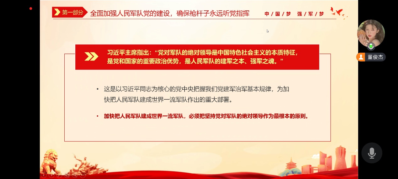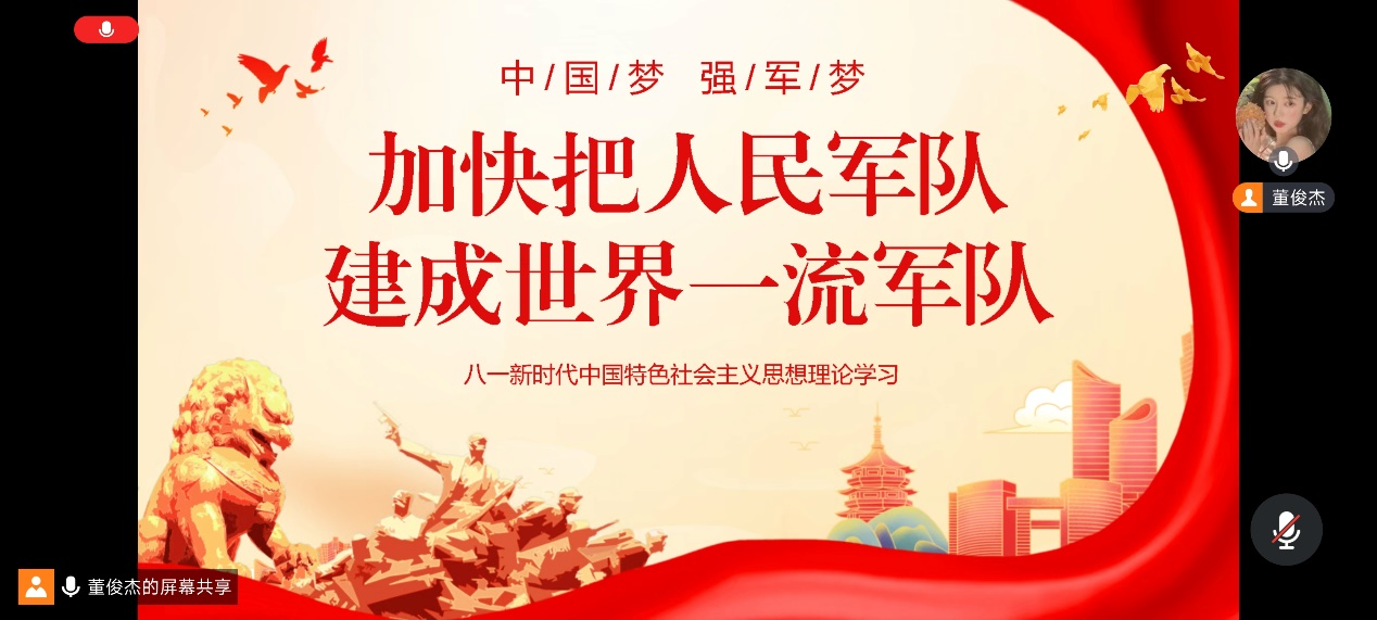 本科生党支部召开主题为《加快把人民军队建成世界一流军队》的线上学习党日活动,会议由分党校秘书长董俊杰主持,全体党员参加。