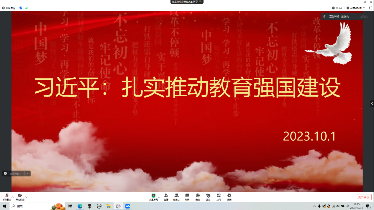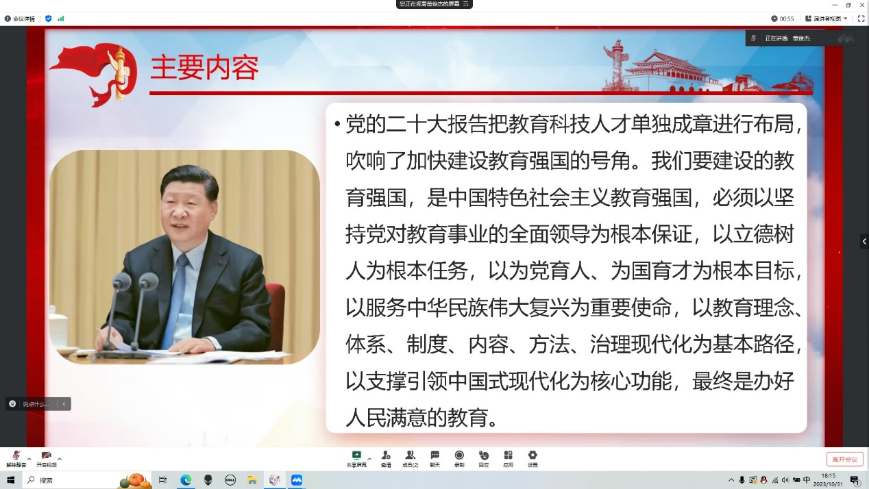 2023年10月21日,篮球现场直播 本科生第一、第二、第三党支部在腾讯会议开展以“扎实推动教育强国建设”为主题的党日活动,会议由分党校秘书长董俊杰主持,全体党员参加。