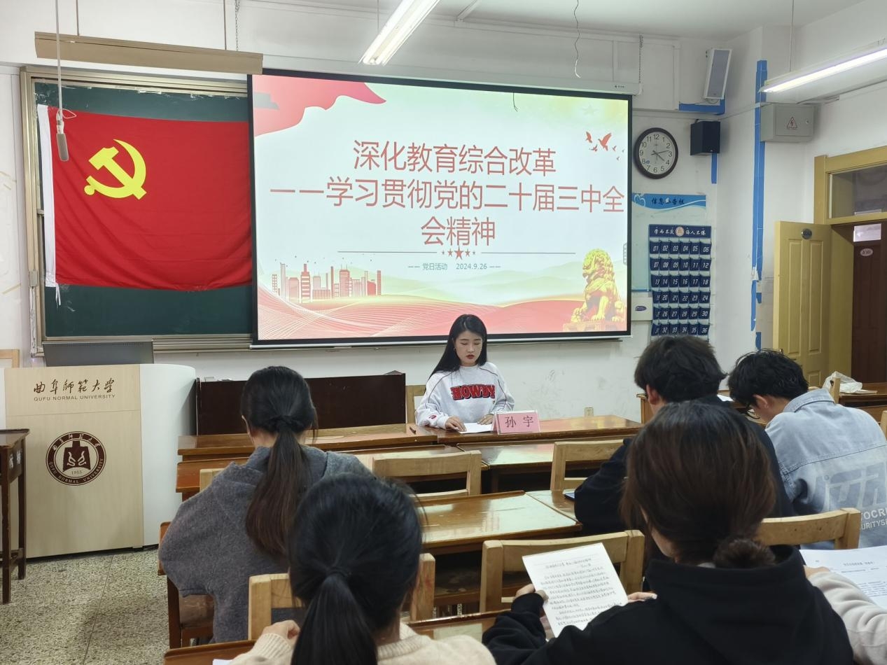 为深入学习贯彻党的二十届三中全会精神,更好地了解教育的综合改革,2024年9月27日下午四点半,篮球现场直播 本科生第二党支部在JC405开展主题党日活动。