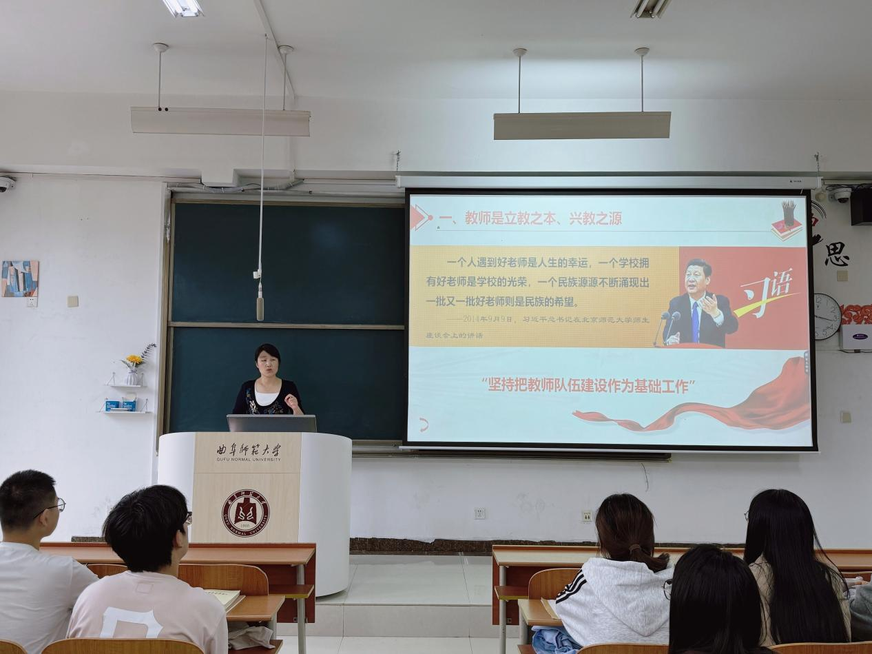 张明洁以“教师是立教之本、兴教之源”为切入点,结合习近平总书记关于教师队伍建设的重要论述和张桂梅等优秀教师的感人事迹,深刻阐释了教师在教育发展与民族未来中的关键作用。围绕“如何成为党和人民满意的好老师”,她分享了往届毕业生的访谈内容,强调“扎实学识是教师的核心素养”,并鼓励同学们在校期间锤炼师德、精进专业,为成长为高素质教师打下坚实基础。