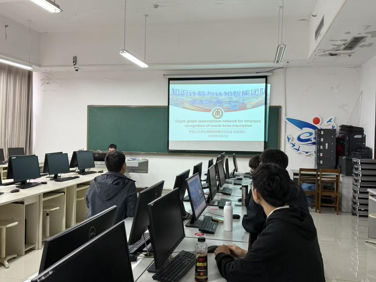 报告中,张展教授系统介绍了其团队在“AI+甲骨文”交叉研究领域的最新进展,重点围绕甲骨碎片缀合、甲骨校重、甲骨图像检索与文字识别等方向展开深入讲解。在交流环节,与会师生与张展教授团队就甲骨字形同构图构建、结构匹配算法及关键点识别技术等前沿问题进行了热烈讨论,并就未来深化合作达成了初步共识。